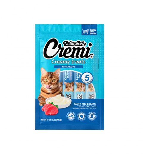 Snack cremoso para gatos de todas las edades. Elaborado con carne de atún, y reforzado con taurina aminoácido esencial para los gatos. La fórmula además contiene extracto de té verde que tiene un alto poder antioxidante. El alto porcentaje de humedad promueve la hidratación junto con un aporte calórico controlado de sólo 6.9 kcal por tubo de Cremi. Excelente opción para utilizarlo con juguetes interactivos, congelarlo en épocas de calor o reducir el estrés al momento de dar un medicamento. Cremi es la mejor opción para fortalecer el vínculo con tu gato.